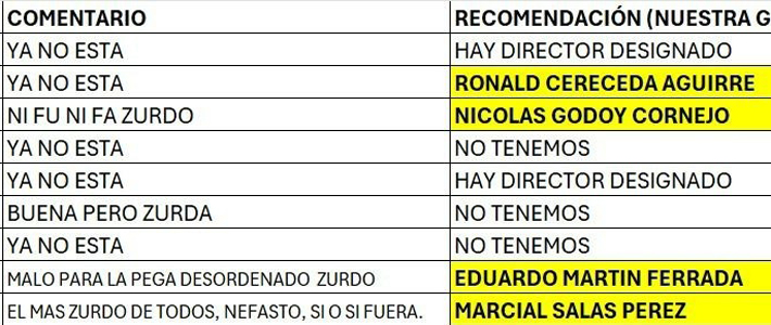 Una fuerte polémica generó la circulación de una supuesta planilla en Excel que incluiría evaluaciones ideológicas de funcionarios públicos, con comentarios como "buena pero zurda", "ni fu ni fa zurdo", "el más zurdo de todos, nefasto, sí o sí fuera".