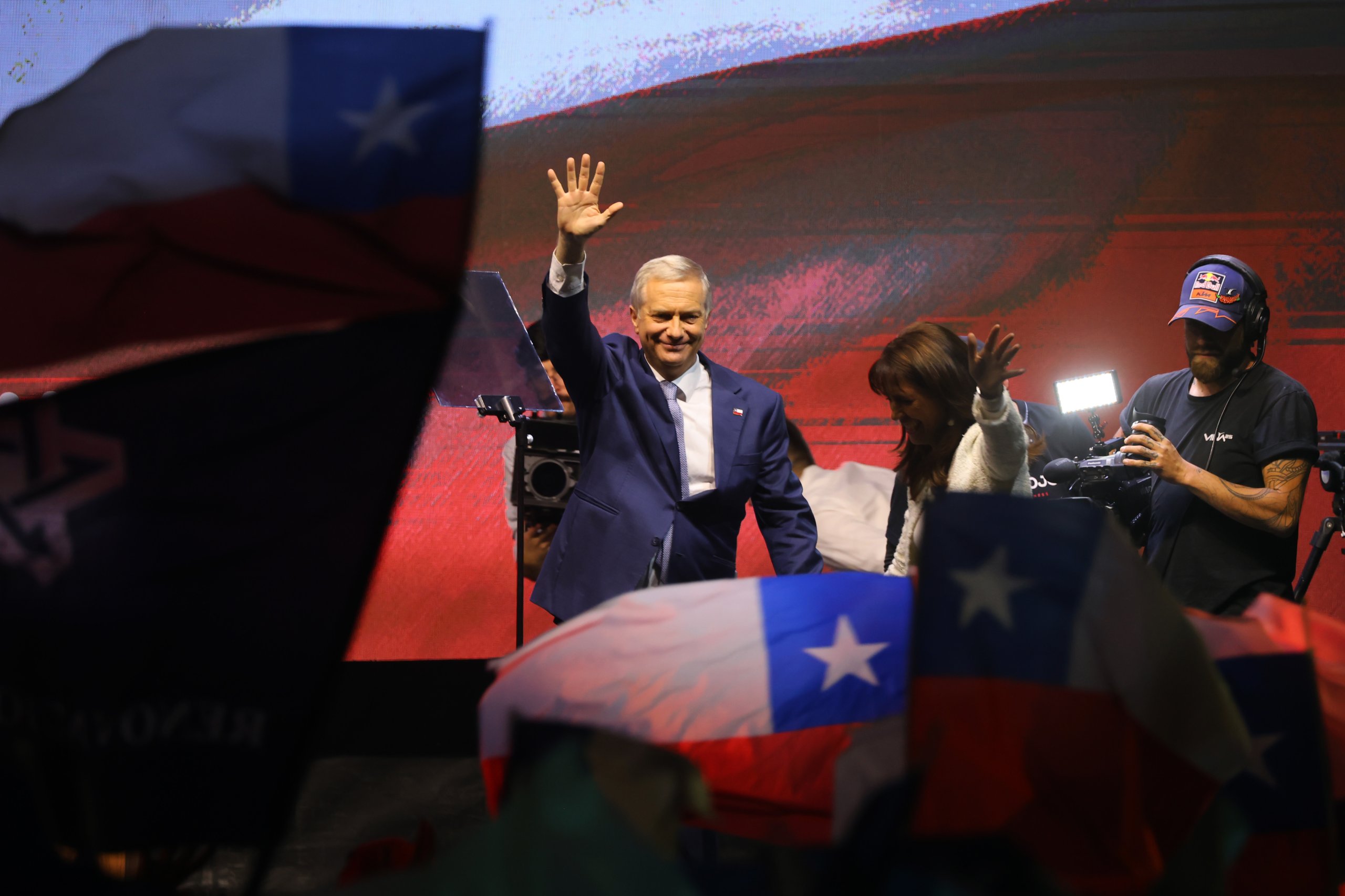 Con banderas chilenas y gritos a favor de José Antonio Kast, el presidente electo llegó hasta Las Condes para decir unas palabras tras su triunfo ante la candidata oficialista, Jeannette Jara, en las elecciones presidenciales 2025.